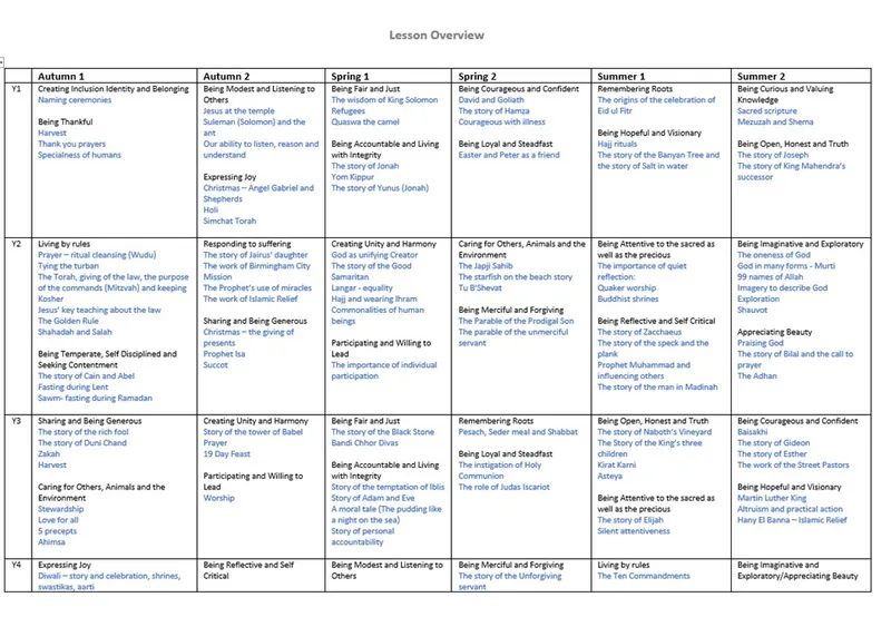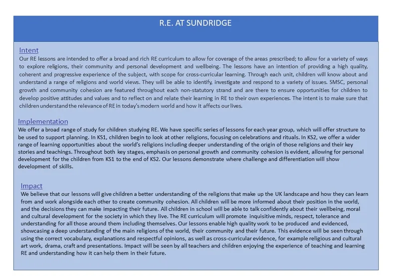 This syllabus was updated in the light of the recent census. At Sundridge Primary School we embedded the latest version of the subject since September 2022. The Birmingham Agreed Syllabus is composed based on 24 key Dispositions which are taught through a spiral curriculum.